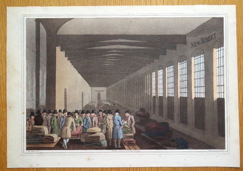 Antique Aquatint LEEDS CLOTH HALL, COSTUME OF YORKSHIRE, G.Walker Original Print 1814
