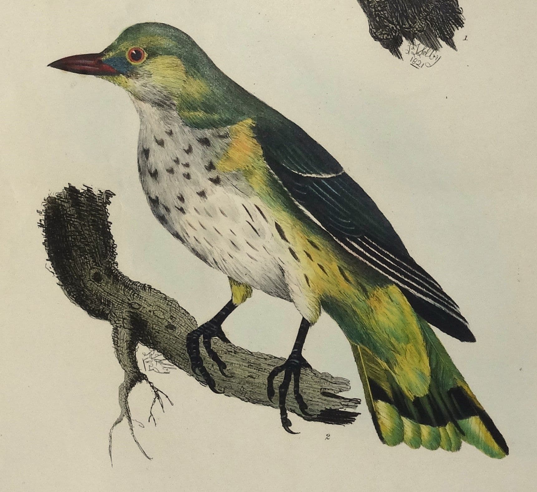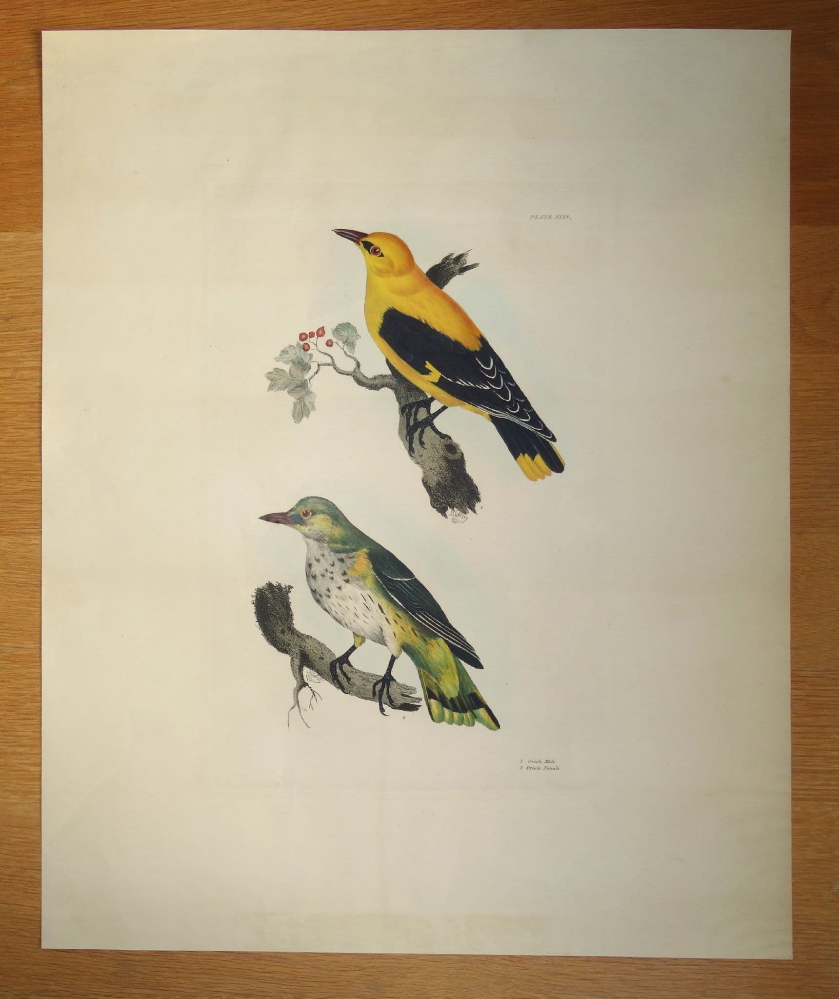 An original early 19th century hand coloured etching of the Golden Oriole, plate No.XXXV.