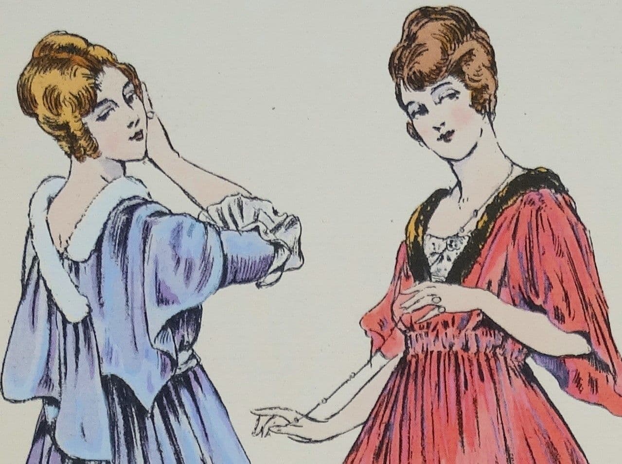 A most attractive larger format antique fashion print created using the delicate hand crafted pochoir colour printing technique by Dartey.