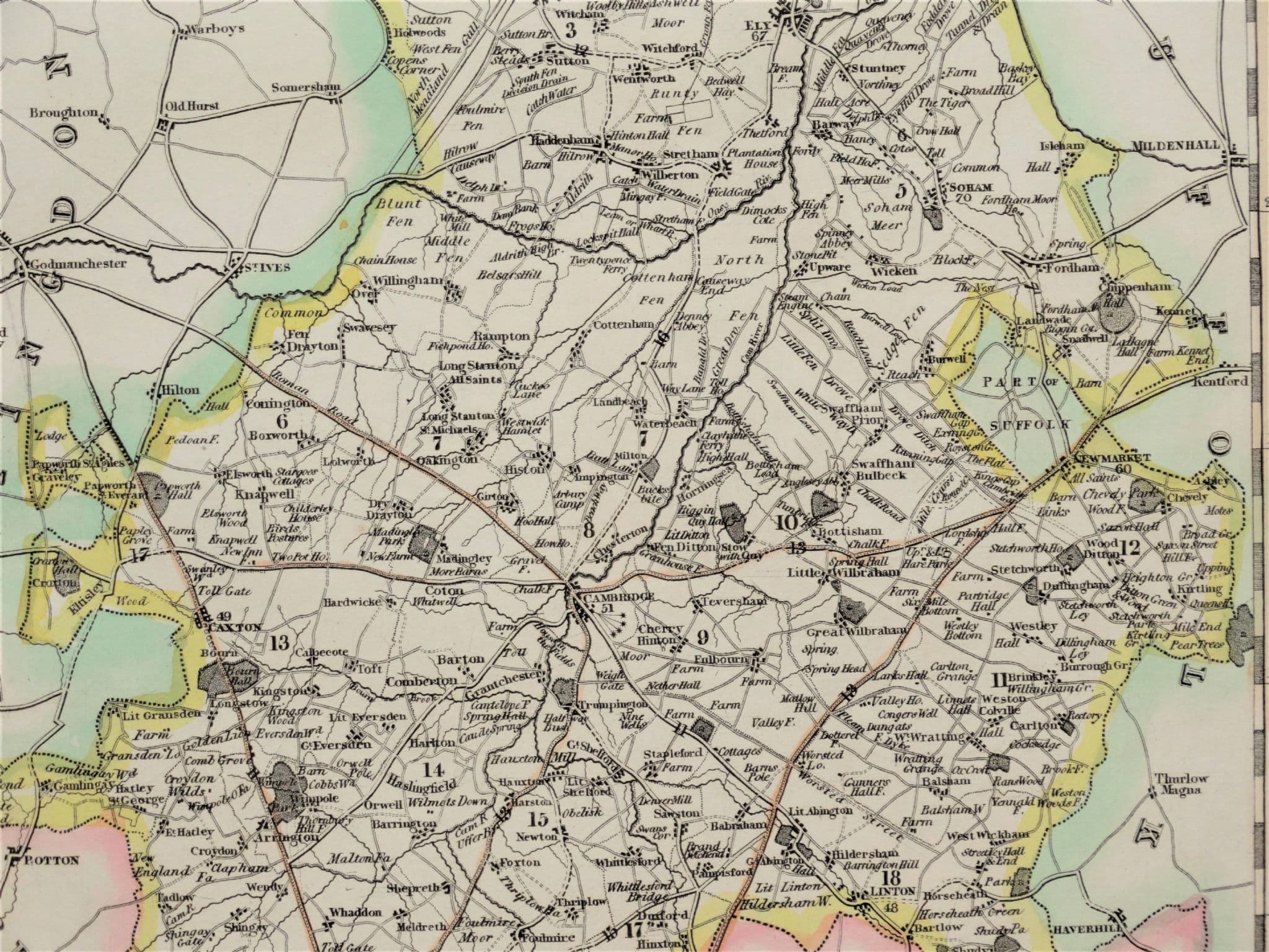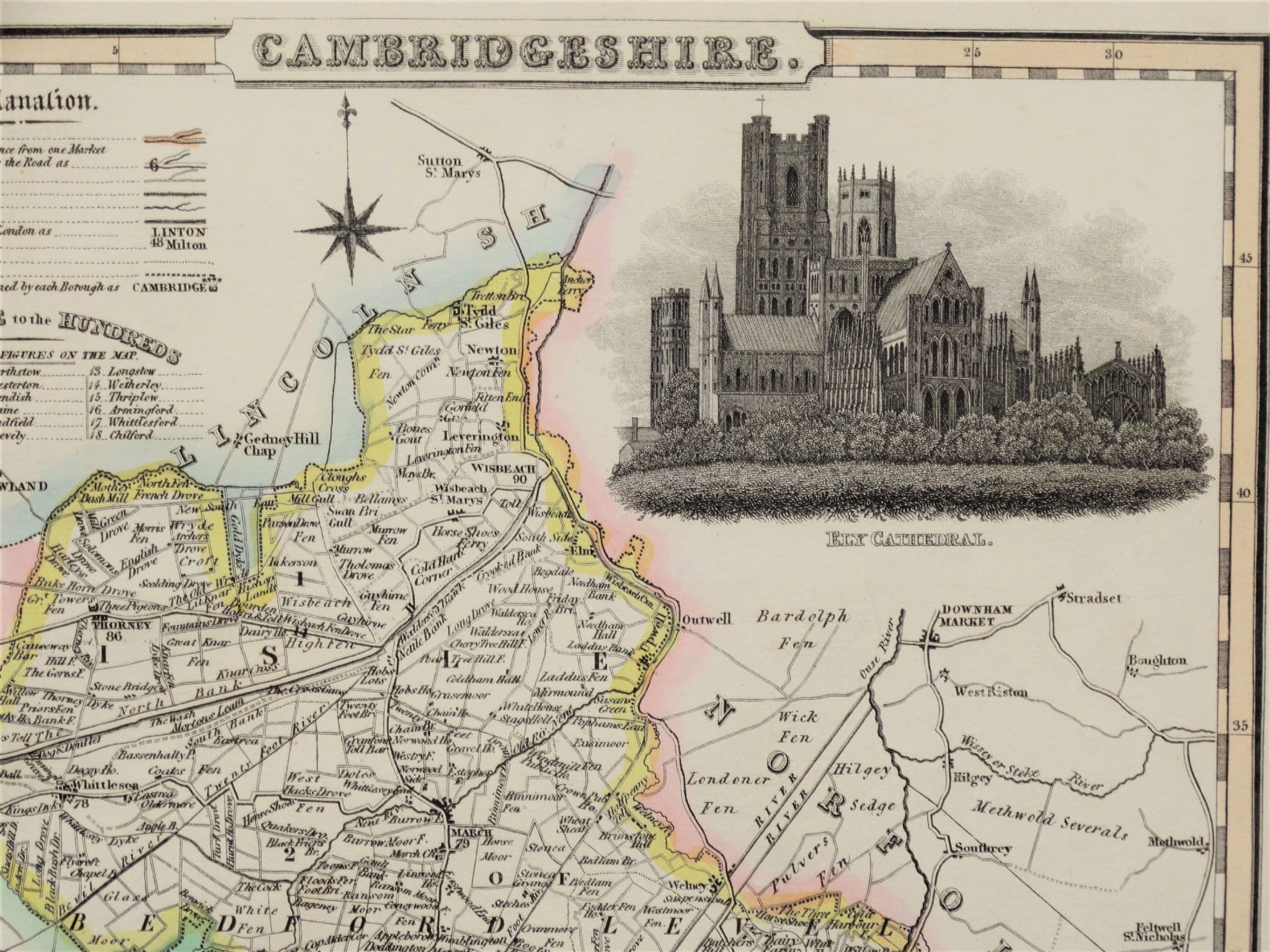 An attractive and good sized map with original hand colouring and a vignette engraving of Ely Cathedral.