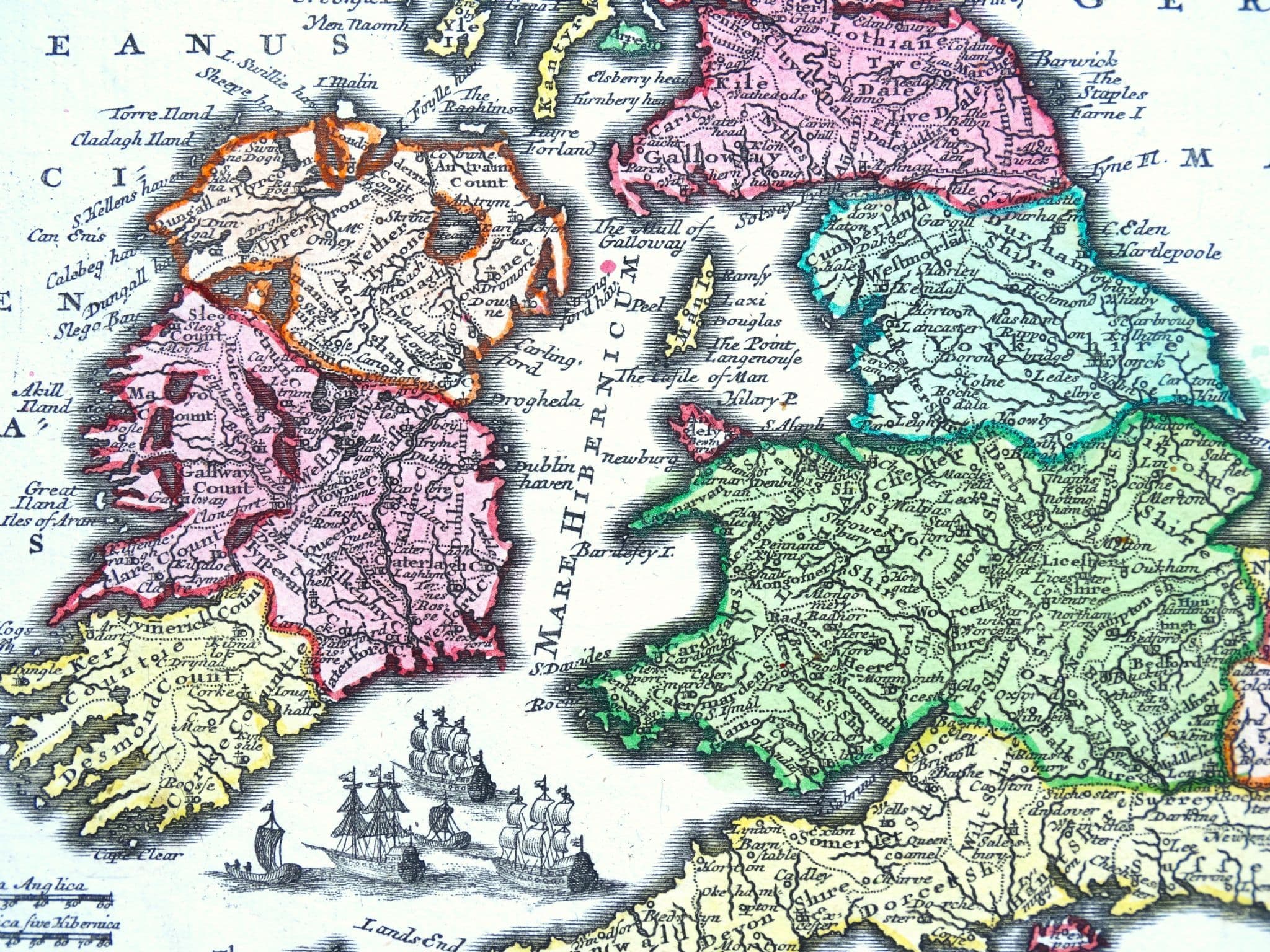 Features the coats of arms of England, Scotland and Ireland and the title is displayed in an elaborate rococo cartouche. Both of these are uncoloured as issued. Decorative engravings of a winged angel and sailing ships further enhance the map.