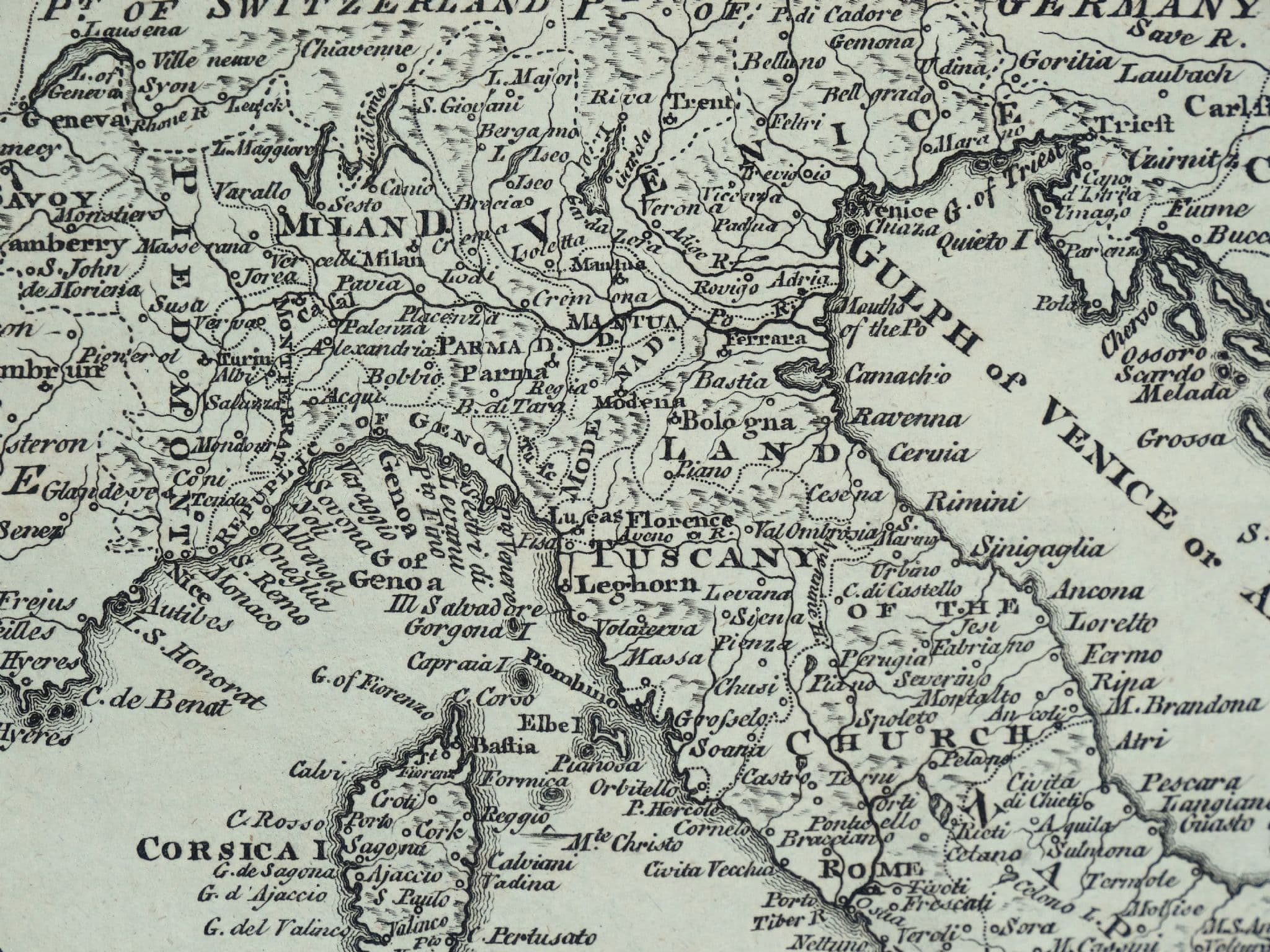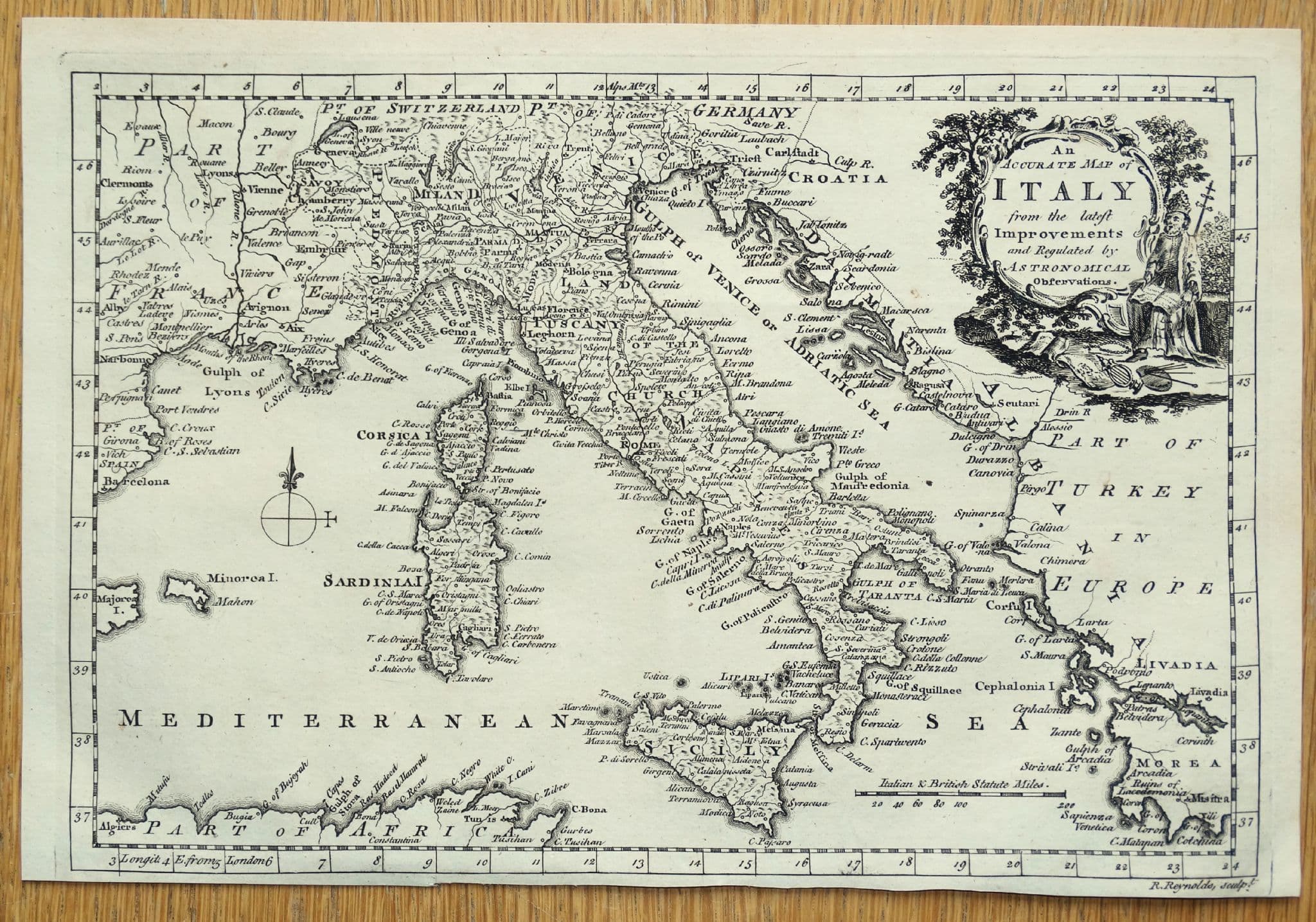 An original 18th century copper engraved antique map of Italy. Scarce.