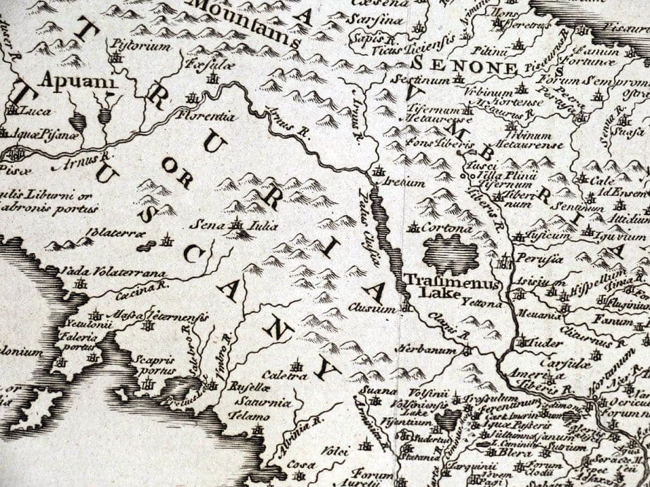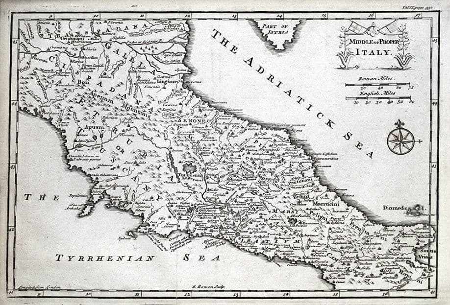 An interesting copper engraved antique map of Central Italy with compass rose and scales of Roman and English miles.