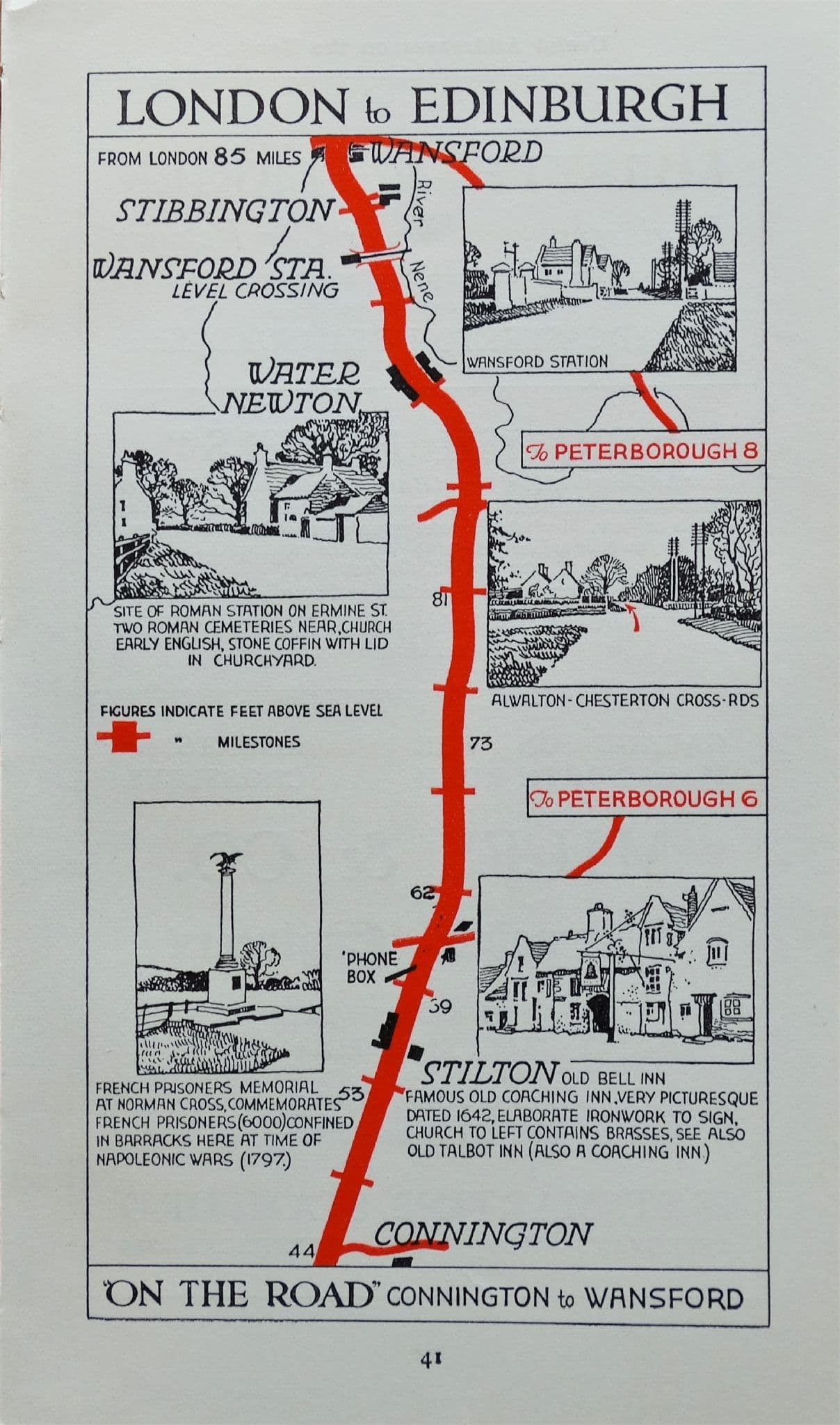 Pictorially depicting a section of the route from London to Edinburgh, this section, the road from Connington to Wansford . Five images depict views along the route including Stilton, Ermine Street & Wansford with some interesting annotations to some of the images.
