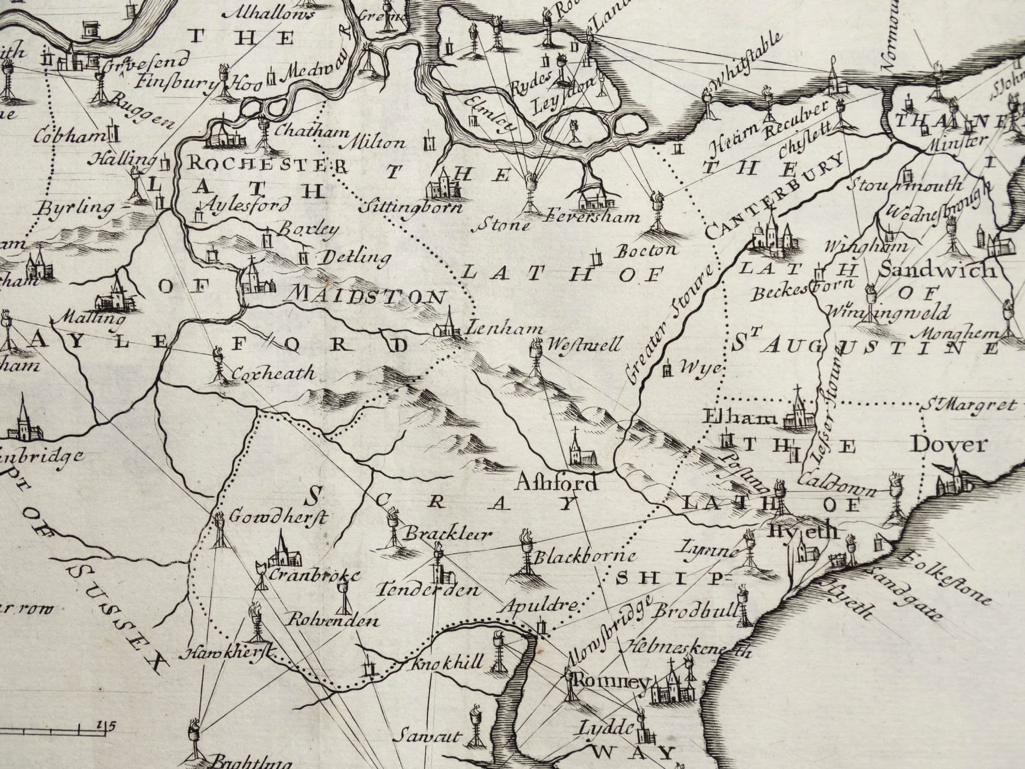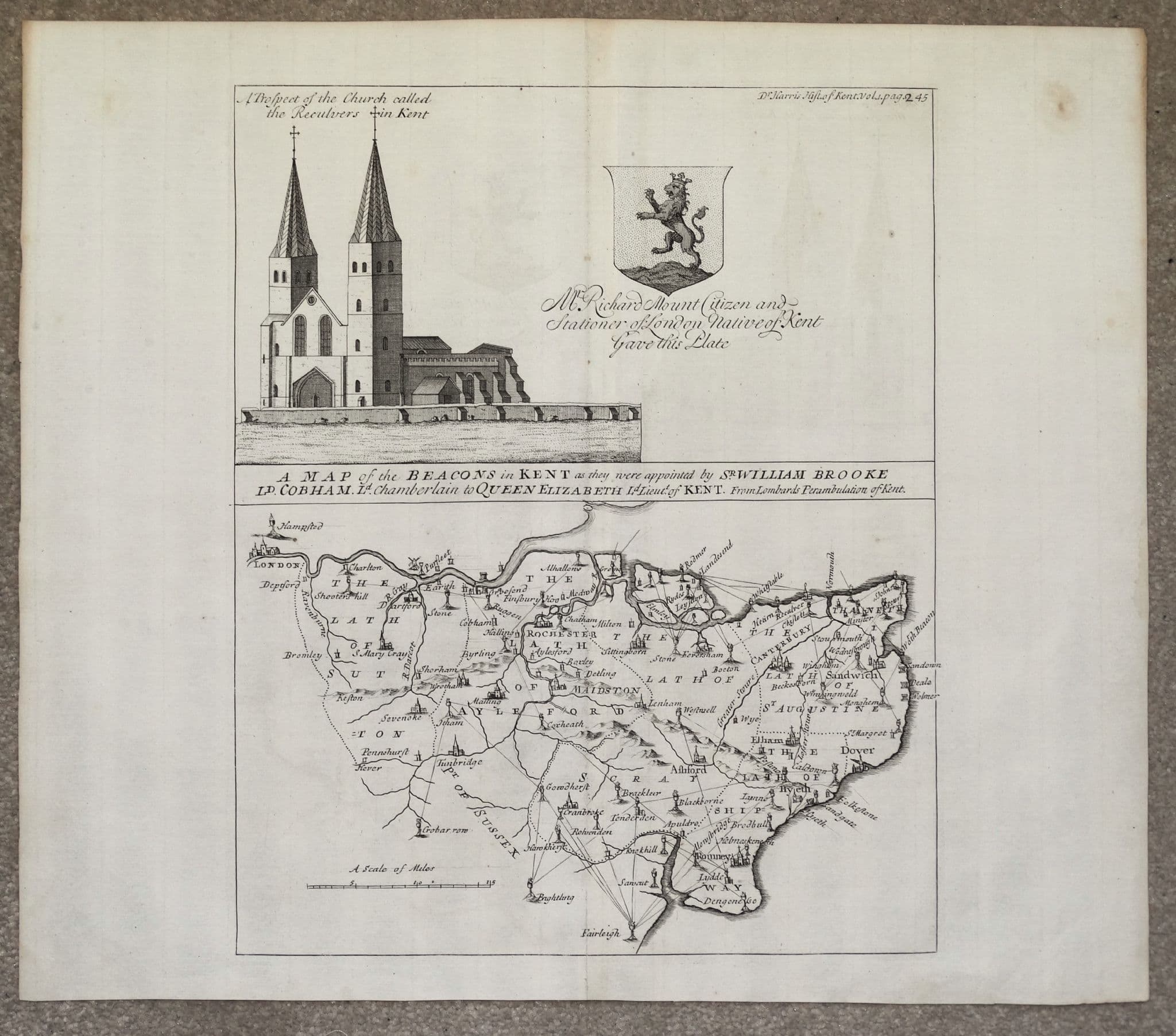 An original early 18th century copper engraved antique map of Kent to show the network of beacon fires intended as first warning of impending invasion by the Spanish Armada.