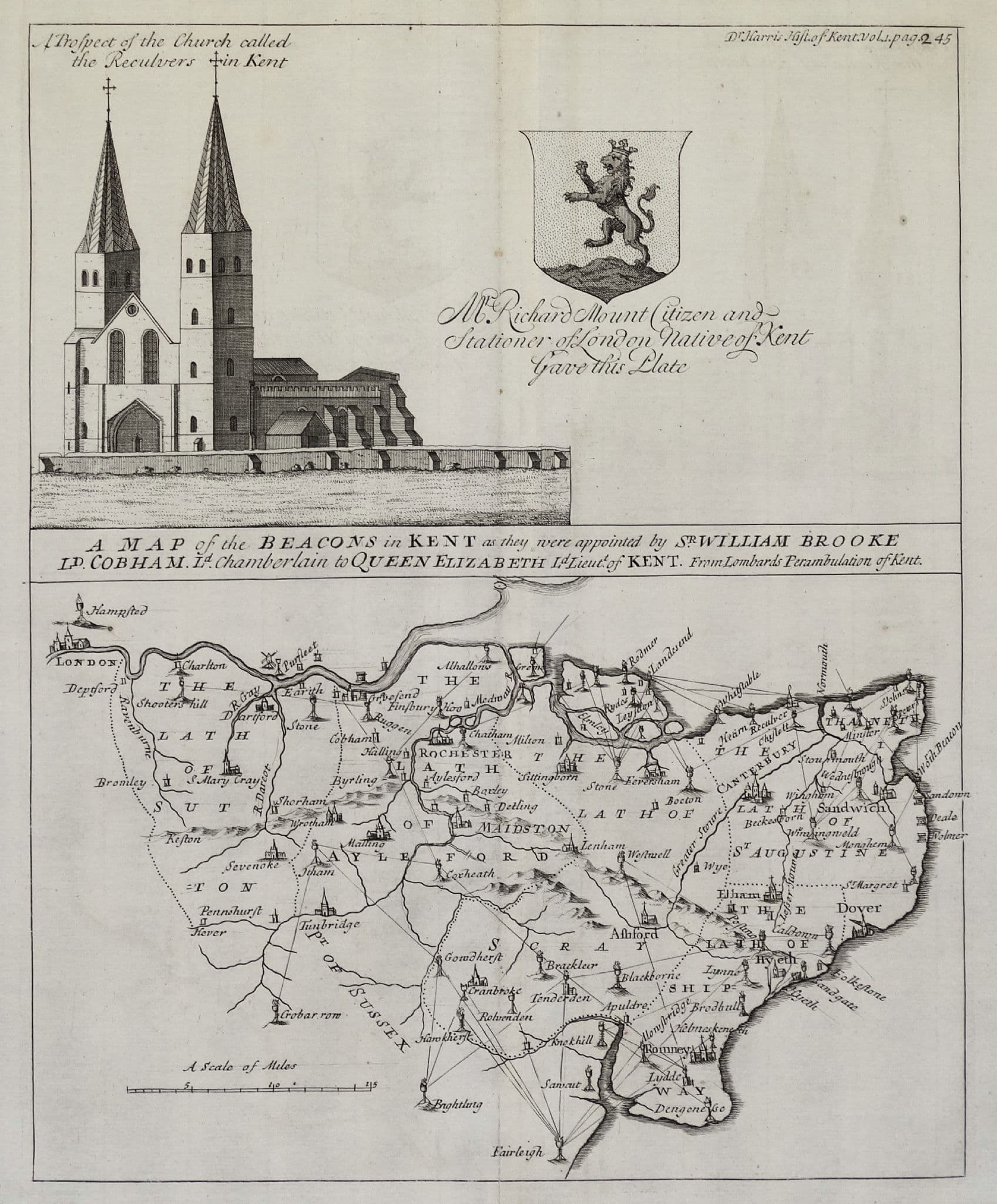 Above the map is an engraved view of Reculver church and an acknowledgement to "Mr. Richard Mount, Citizen and Stationer of London native of Kent" who provided the plate.