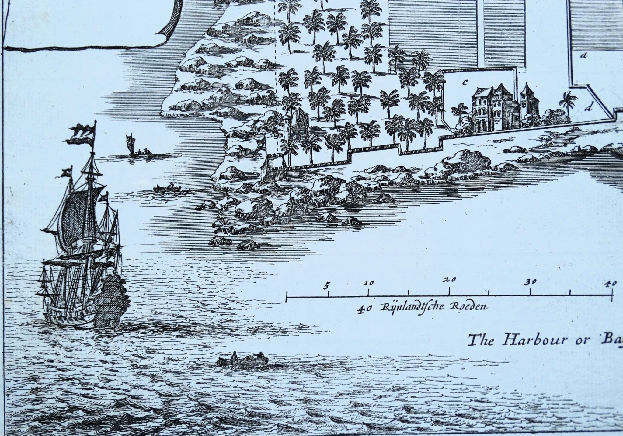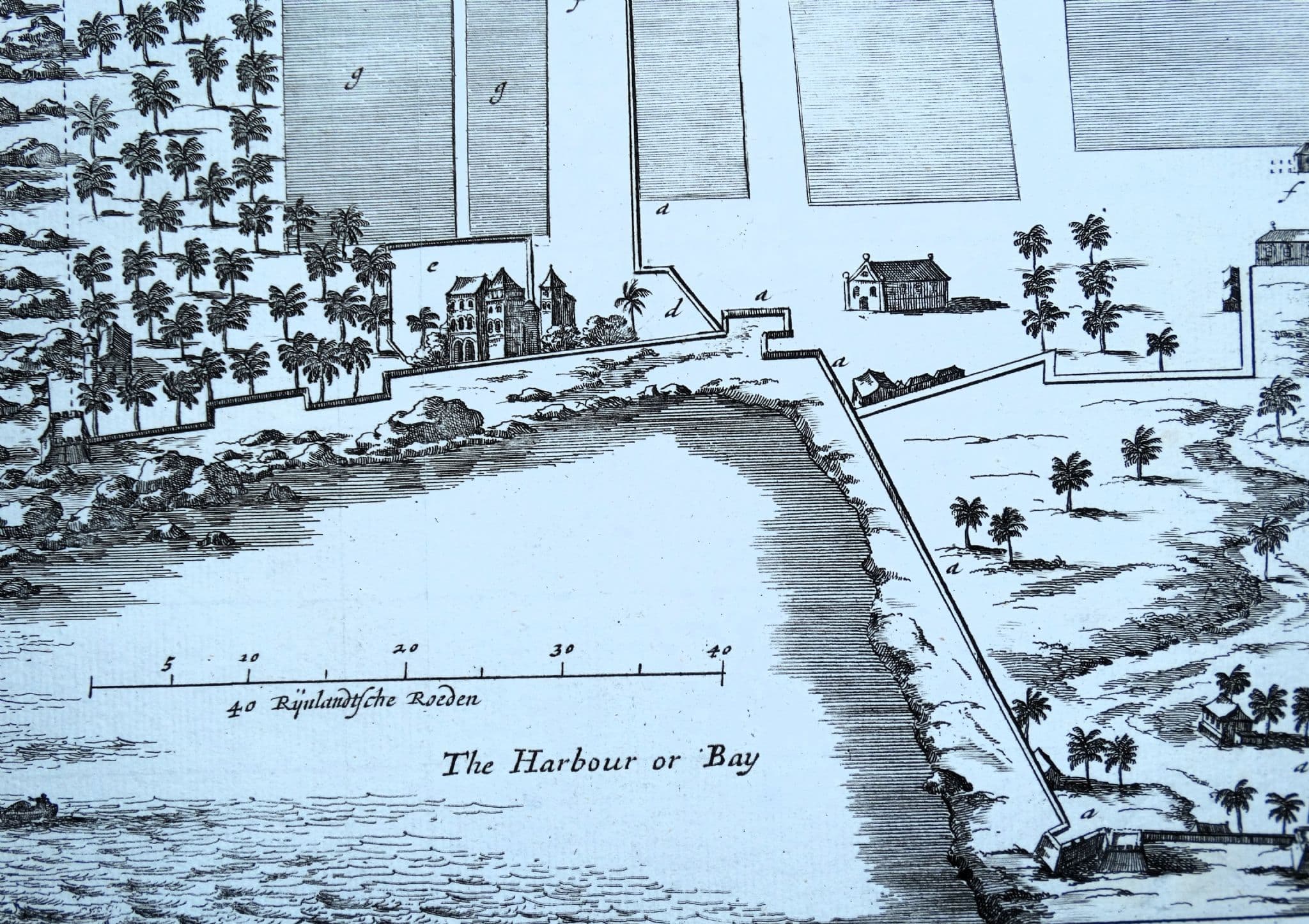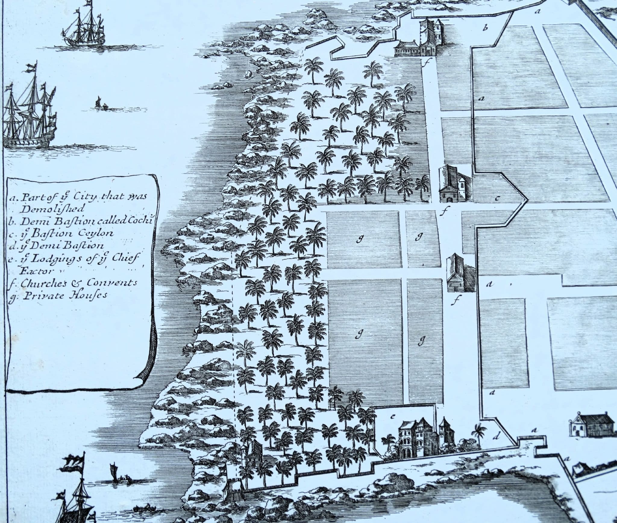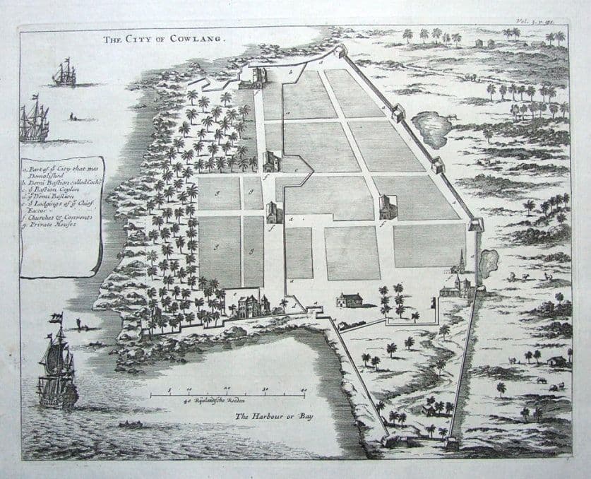 An interesting copper engraved bird's eye view of present day Quilon or Kollam in Kerala, India. A lettered key identifies several locations within the walled city. Scarce.