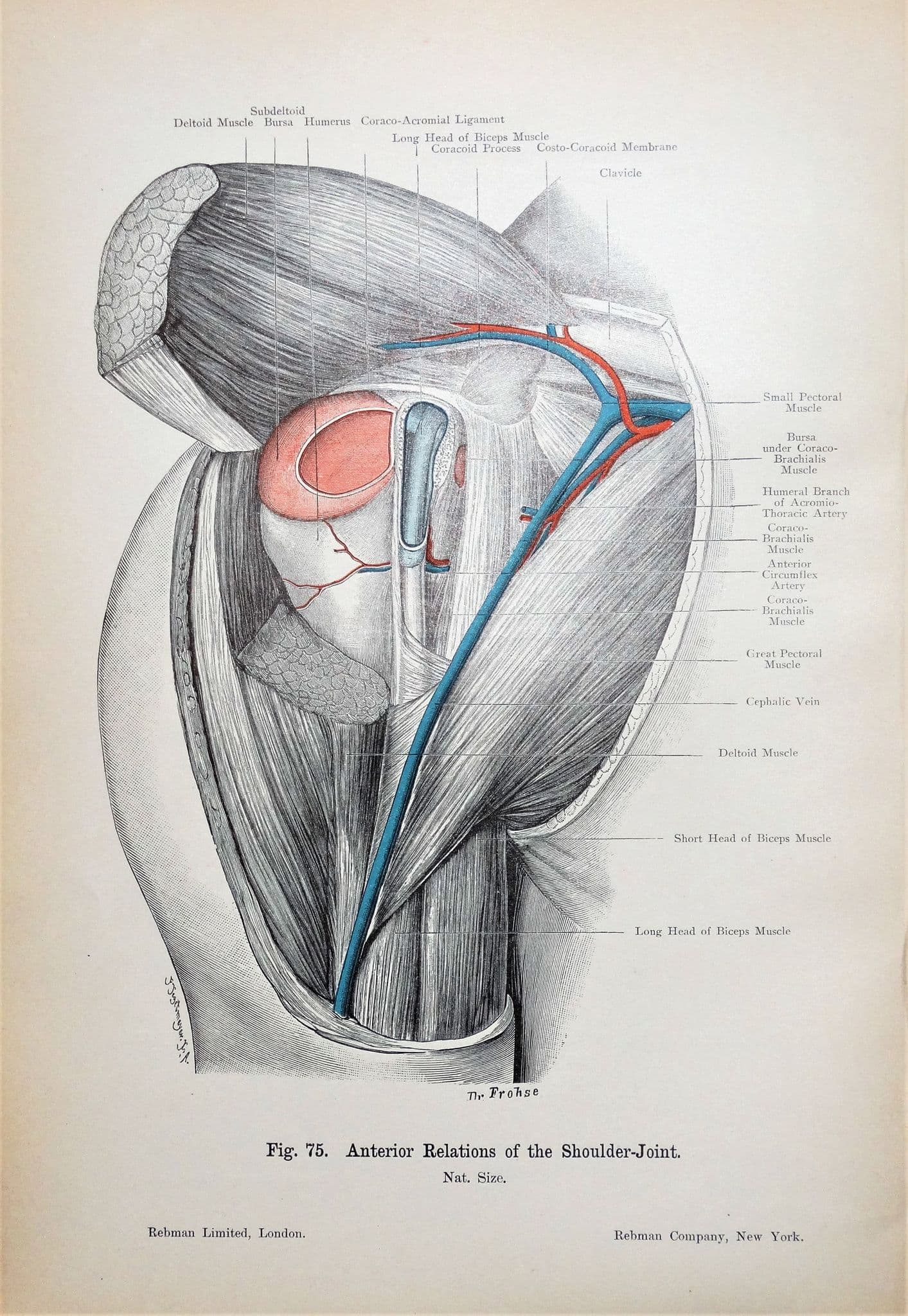 A superbly detailed antique anatomy lithograph of an anterior view of the structures of the Shoulder Joint.